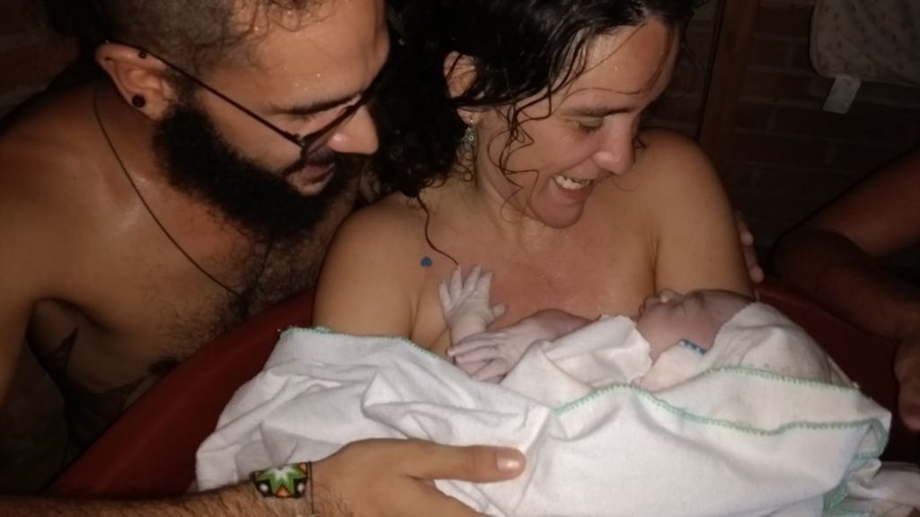 Parí a mi hijo parada, sostenida de un lado por el papá y del otro por mi hermana. El trabajo de parto fue fluido, me acuerdo tener los ojos casi siempre cerrados en el momento de las contracciones y luego unas manos me daban un masaje, me acercaban un popote con agua de coco, un dátil, agua…